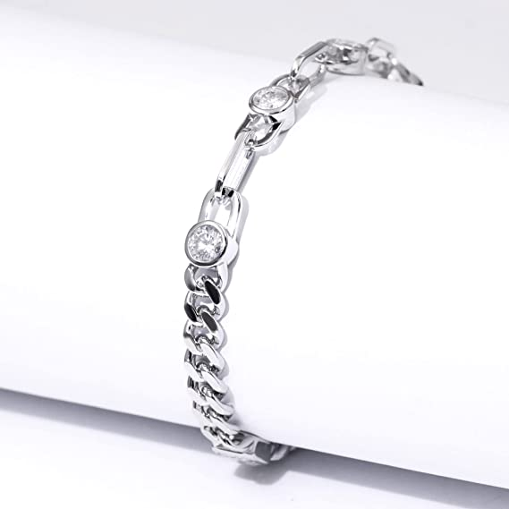 Moissanite Silver Bracelets for Women I 3Ctw DF VVS Emerald Cut Moissanite Diamonds I 18K White Gold Plated 6mm Cuban Link Chain Charm Bracelet I 6.5-7.5 Inch
