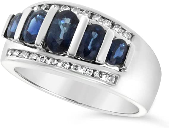14k White Gold Blue Sapphire Oval Five Stone Genuine Gemstone and Diamond Ring For Women Birthstone of September